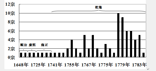 在中国历史上,有清一代的文字狱数量之多、规模之大、株连之广、力度之强、处罚之惨、祸害之烈、实属空前。据不完全统计,“清代文字狱当在160-170起左右,比历史上其他朝代文字狱总数还要多。”[21]“中国通史权威”邓之诚曾根据《清代文字狱档》、《东华录》和《掌故丛编》等文献,从案由、时期、事略、定谳和备考五个方面入手制成“清代文字狱简表”,仔细梳理了清代顺治、康熙、雍正、乾隆四朝影响较大的82宗文字狱。从“清代文字狱简表”来看,顺治朝和康熙朝各有2宗,雍正朝有4宗,乾隆朝则多达74宗。从1648年(顺治五年)到1788年(乾隆五十三年)的140年间,平均不到2年就有1宗文字狱。在乾隆朝,从1741年(乾隆六年)到1788年的47年间,平均每年就有1.57宗(见图3)。对此,邓之诚感慨道:“乾隆时,一字违碍,每兴大狱,犯者以大逆谋反论,本身兄弟及其子成年者,皆处决,妻若幼子,流宁古塔、尚阳堡等地。自生民以来,未有如是之惨酷者也。”[22]