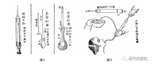 现代注射疗法应于晚清时期由西方来华传教士传入中国,虽确切传入日期难以考证,但1857年刊印的《西医略论》上卷载有一种称为“玻璃水节”的器具,并称“钢铅皆可为之”。从图例来看,该类“水节”包括带活塞的针筒和空心针,区别于传统套管针(见图1)。该书中卷称,“救服鸦片毒”时,对于昏迷不能吞咽药物的病人,“应用大水节,前装软长管,自喉入胃,水节下承以盆,另有一管引盆中水贮水节,射入胃中约一斤,将胃中毒水抽出”。并附“射水入胃铜节图”(见图2)。文中虽有“射水入胃”的提法,但没有出现“注射”一词。此外,文中两处描述的器具虽皆统称为“水节”,且原理类似,但严格意义上却是两种装置。一般来说,前者是指“注射器”,后者是指“洗胃器”。
