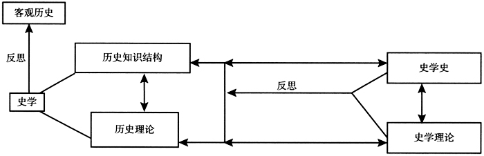 上图的单箭头表示反思的指向,双箭头表示具有明显的学术互动的关系。而客观的历史作为所有广义历史认识的依据,史学之内所有发展出来的认知之间有着互动、互补、互为检验的关系,都是不言而喻的,图中不作标示。这里需要注意的是历史理论与史学理论的联系与区别,重点在于厘清二者乃为不同的概念,具有很不一致的内涵。在上文已经辨明“历史”与“史学”两个概念之区分的基础上,顺理成章,历史理论与史学理论的区别也应当是清晰的,然而情况并不那么简单。因为历史理论和史学理论都在广义的历史认识范围之内,都是历史学科中的事项,许多人没有察觉将之区别开来的必要,而且二者确有较为密切的联系,很容易混含在一起。西方史学大多流派既然不分历史和史学,也就没有区分历史理论与史学理论的概念。中国的马克思主义史学,虽然对客观历史与历史学的区别有明确的认识,但马克思主义的经典作家,主要致力于历史理论即唯物史观的探索和论述,不暇进行史学理论方面深入、系统的研究。所有这些因素,致使史学界长期忽略了历史理论与史学理论的区别,至今行世的大量书名中标示为“史学理论”的撰述,内容多含有高比例的历史理论的内容,甚至完全以历史理论的论述为主,可见其普遍与严重的程度。