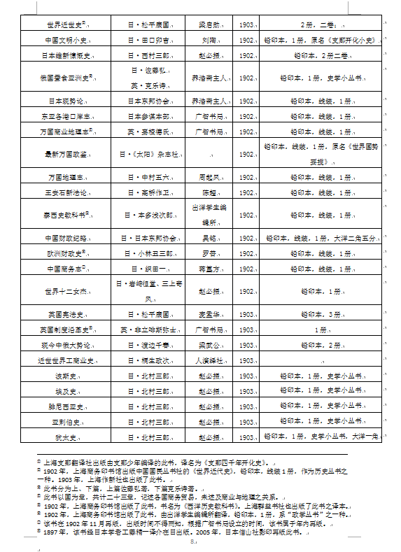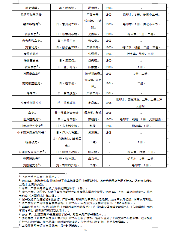第二,译介图书“以东文为主,辅以西文”。在广智书局的所有出版物中,译自外国图书194种,占总出版物数量的一半左右。[25]而在译介的外国著作中,译自日本学者的作品又占据了多数。仅有极少数作品译自或者转译自美、英、法等国学者的著作。这与当时在华的外国出版机构译介图书对象有极大差异。日本在明治维新之后,大量聘请西人,翻译西史,历史科目建设相对完备,形成了“支那史”、“东洋史”、“西洋史”研究机构,出版了丰富的历史著作。